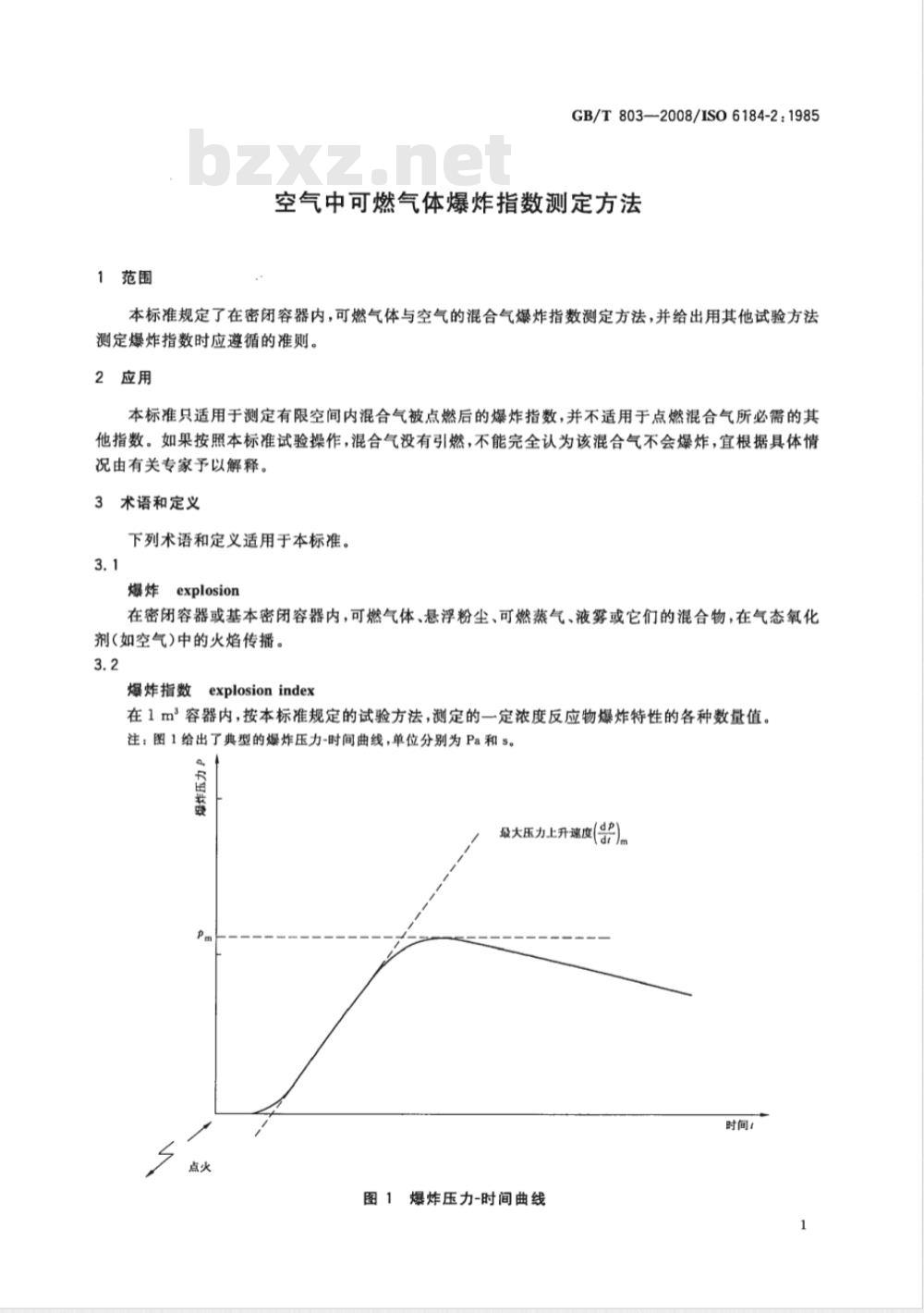 GB/T803—2008/IS06184-2:1985空气中可燃气体爆炸指数测定方法本标准规定了在密闭容器内,可燃气体与空气的混合气爆炸指数测定方法,并给出用其他试验方法测定爆炸指数时应遵循的准则。2应用
