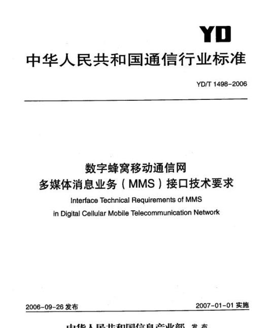 YD/T 1498-2006.Interface Technical Requirements of MMS in Digital Cellular Mobile Telecommunication Network. 1范围 YD/T 1498规定了数字蜂窝移动通信网多媒体消息业务相关的功能实体之间
