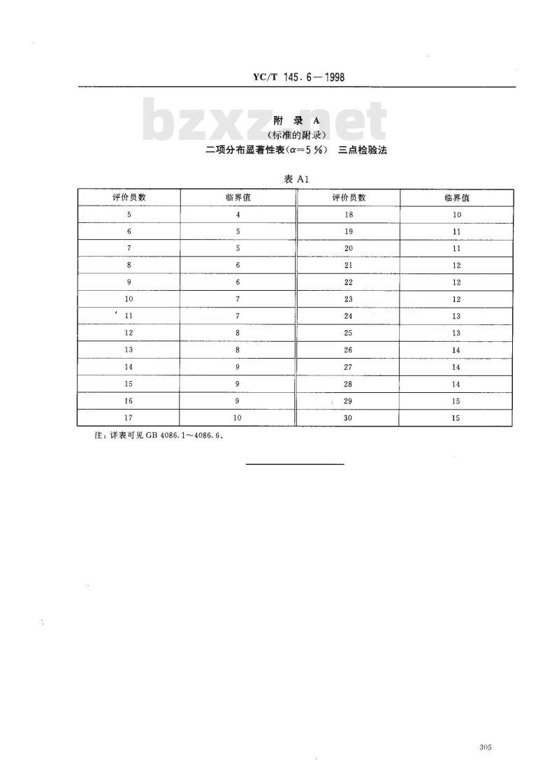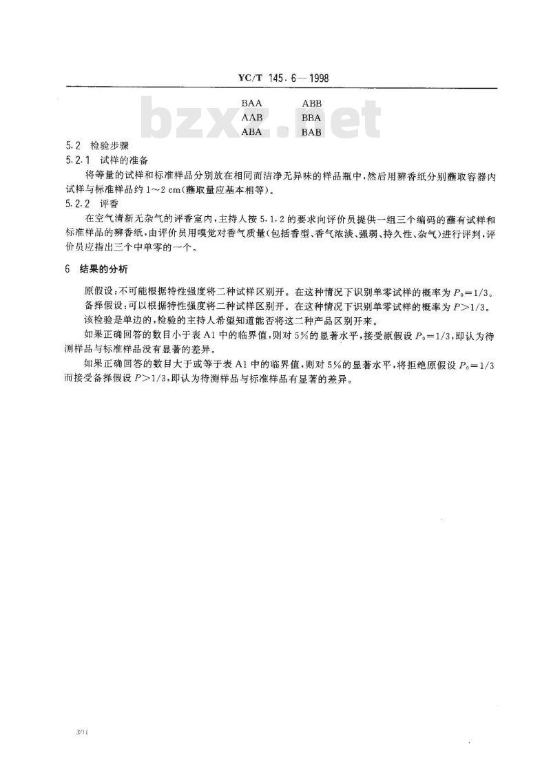 原假设:不可能根据特性强度将二种试样区别开。在这种情况下识别单零试样的概率为P。=1/3。备择假设:可以根据特性强度将二种试样区别开。在这种情况下识别单零试样的概率为P≥1/3。该检验是单边的,检验的主持人希望知道能否将这二种产品区别开来。如果正确回答的数目小于表A1中的临界值,则对5%的显著水平,接受原假设P。一1/3,即认为待测样品与标准样品没有显著的差异。如果正确回答的数自大于或等于表A1中的临界值,则对5%的显著水平,将拒绝原假设P。=1/3而接受备择假设P>1/3,即认为待测样品与标准样品有显著的差异。3n1