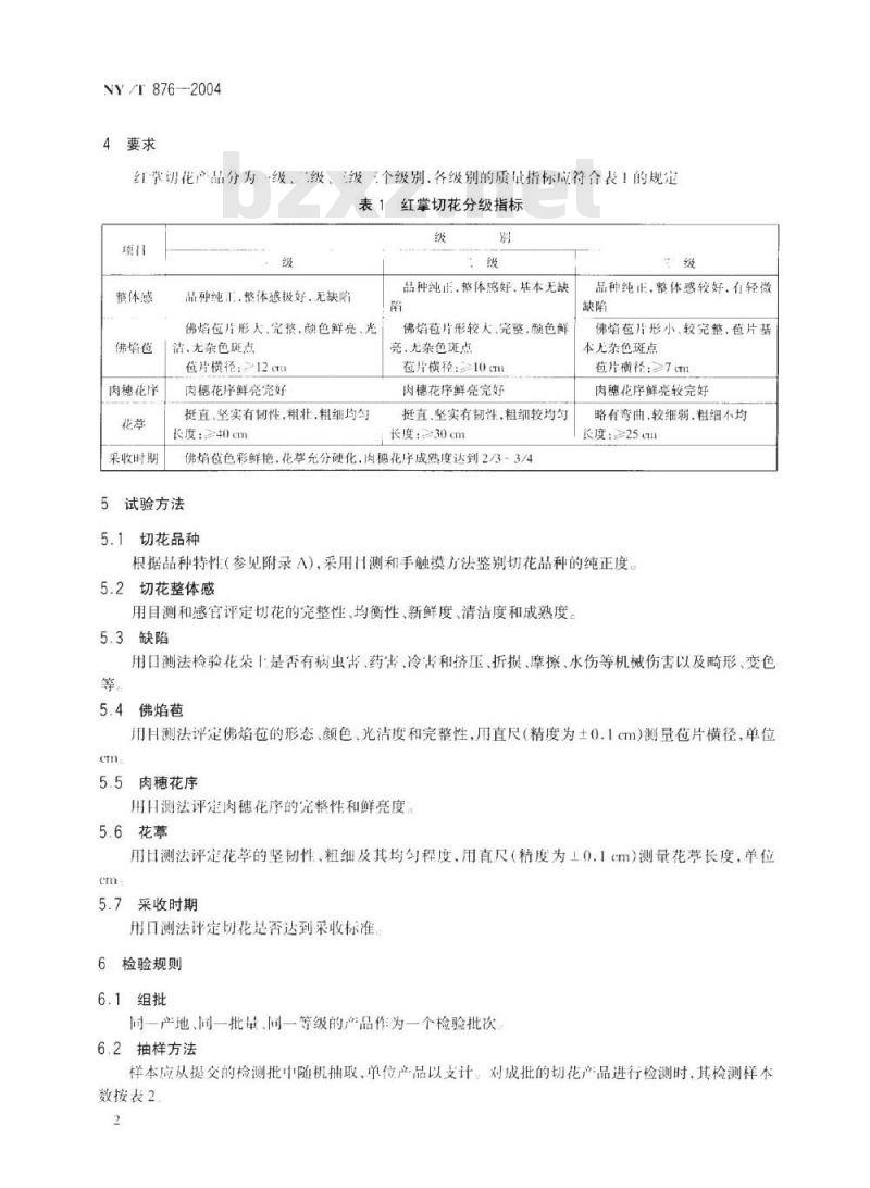 整体感、佛焰苞、肉穗花序、花掌4项指标均达一级标准的定为·级品;若其中一项符合二级品标准,定为二级品若其中一项符合二级标准,定为三级品;低于二级品标准的,定为不合格产品。6.4.2复验规则