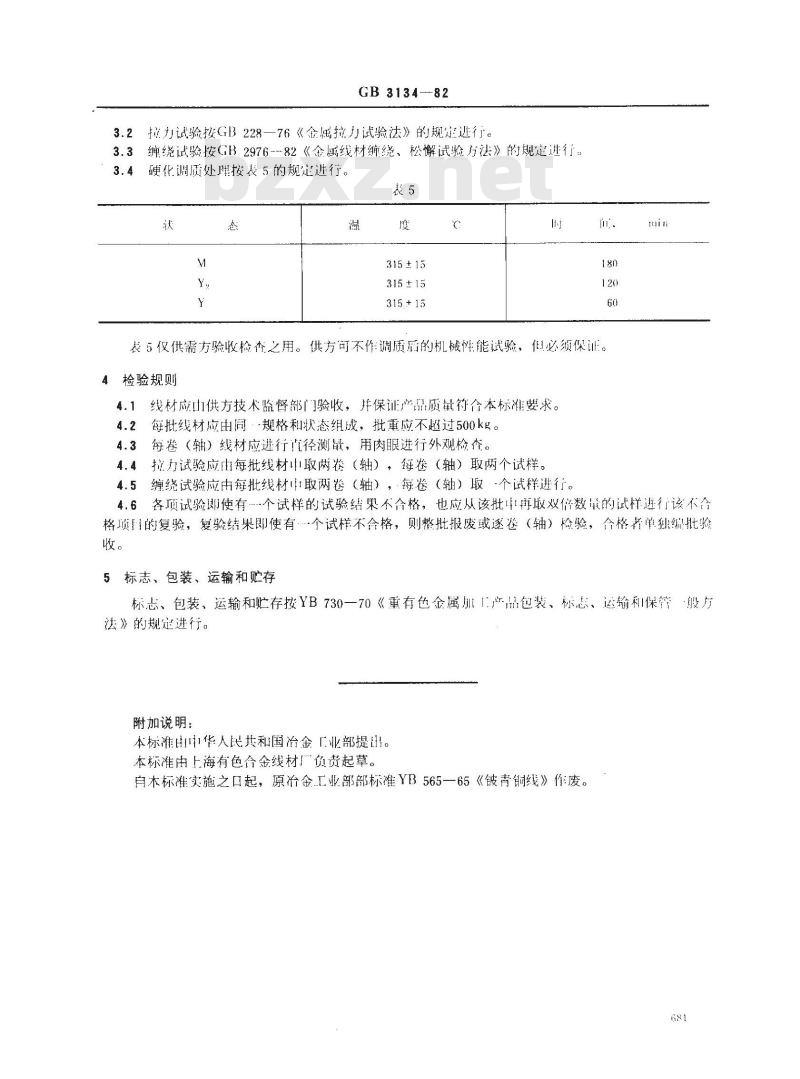 3.2拉力试验按GB228一76《金属拉力试验法》的规定进行。3.3缠绕试验按GB2976-82《金属线材缠绕、松懈试验方法》的规进行:3.4硬化调质处理按表5的规定进行。表5