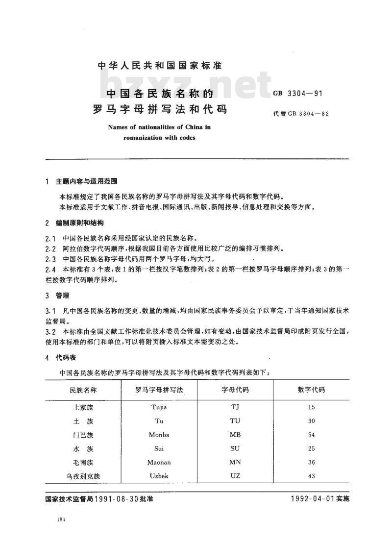 本标准规定了我国各民族名称的罗马字母拼写法及其字母代码和数字代码。本标准适用于文献工作、拼音电报、国际通讯、出版、新闻报导、信息处理和交换等方面。 GB 3304-1991 中国各民族名称的罗马字母拼写法和代码 GB3304-1991