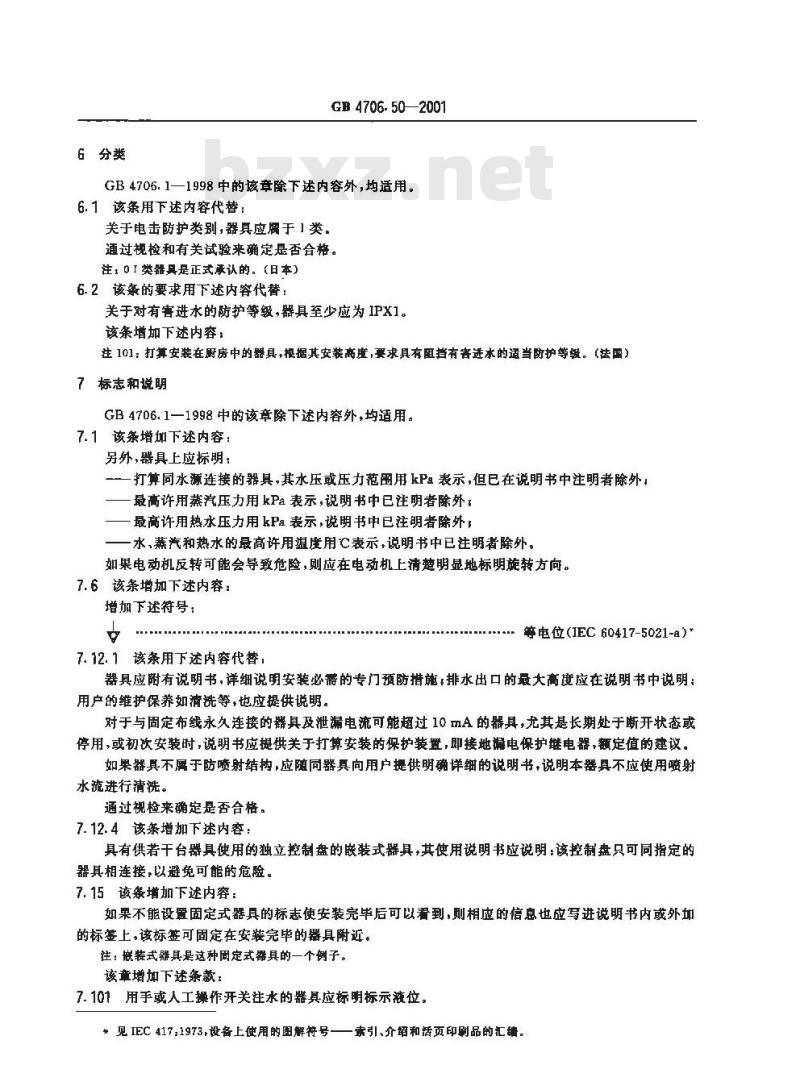 关于电击防护类别,器其应属于1类,通过视检和有关试验来确定是否合格。注:0I类器具是正式承认的。(日本)6.2该条的要求用下述内容代替:关于对有害进水的防护等级,器具至少应为IPX1。该条增加下述内容: