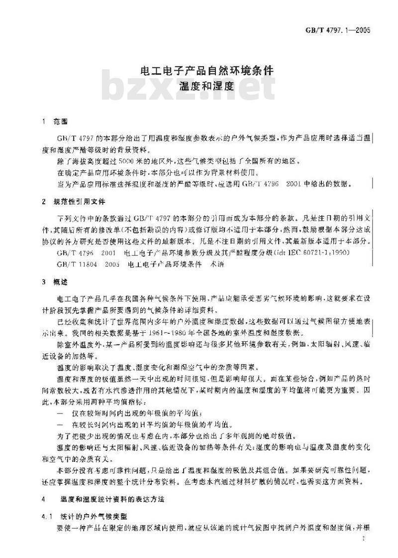 GB/T4797本部分给出了温度和湿度参数表示的户外气候类型,作为产品应用时选择适当温度和湿度严酷等级时的背景资料。 GB/T 4797.1-2005 电工电子产品自然环境条件 温度和湿度 GB/T4797.1-2005