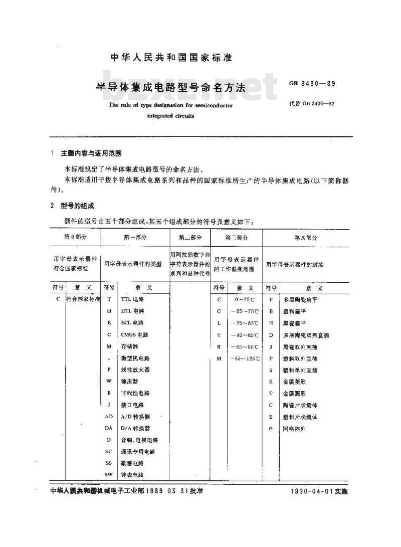 本标准规定了半导体集成电路型号的命名方法。本标准适用于按半导体集成电路系列和品种的国家标准所生产的半导体集成电路(以下简称器件)。 GB 3430-1989 半导体集成电路型号命名方法 GB3430-1989