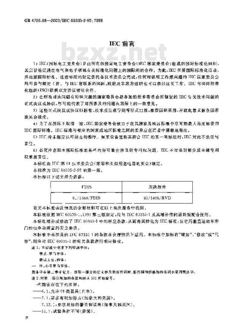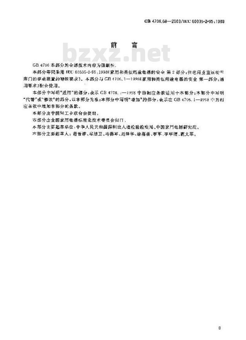 本部分由中国龄工业联合会提出,交部分出全国家用电器标准化技术委员会归,平部分主要起草单位:中毕人民共和国深圳出人竞检验检疫局、中国家月电器新究院。太部分主要超草人:谢普雄、部旭卫、与德军、刘体毕、徐语猎、李军、享毕消.鹿文军,GB4706.682003/IEC60335-2-95:1998IFEC前言