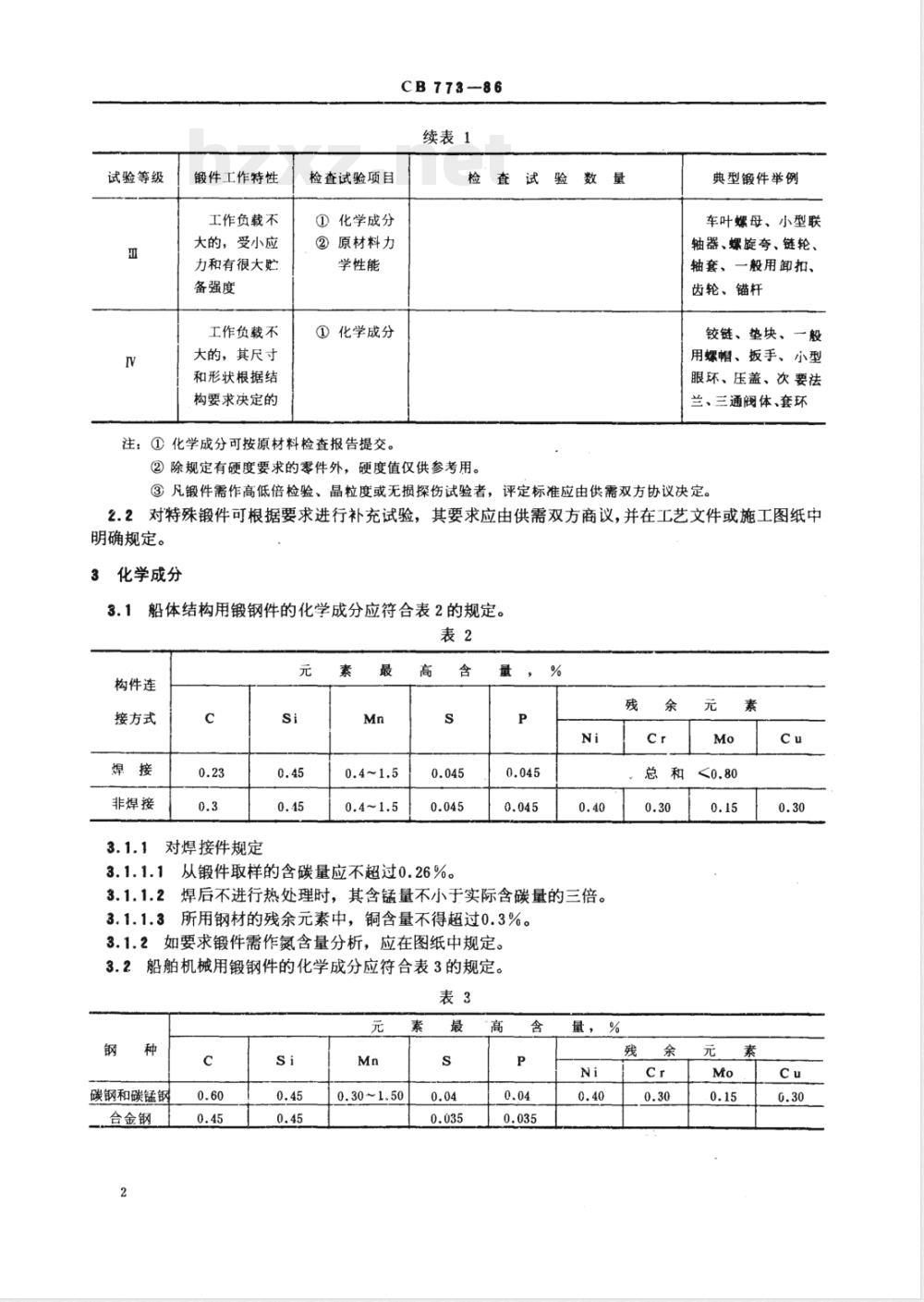 注:①化学成分可按原材料检查报告提交。CB773—86