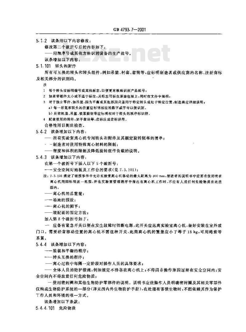除下述内容外,IEC 61010-1的该章均适用。该条用以下内容代替:本标准适用于电动实验室离心机。该条增加以下内容:——分离易燃易爆材料时应注意的附加预防措施(见5.4.4.101);——分离具有强烈化学作用的材料时应注意的附加预防措施(见5.4.4.101)。该条增加以下内容:——IEC 60034规定范围内的旋转电机;——用于易爆炸气体中的离心机。该条增加以下内容:——与运动部件的接触(见7.2);——破损情况下离心机的移动(见7.3.101);——易弹射出的零件(见7.5);——由旋转组件射入排气系统的小颗粒(见7.5.104);——转头破损后的高能化学反应(见7.5.105);——密封圈失效(见13.101)。该条用以下内容修改:修改第三个破折号后的内容如下:——温度2℃~40℃。 GB 4793.7-2001 测量、控制及实验室用电气设备的安全 实验室用离心机的特殊要求 GB4793.7-2001