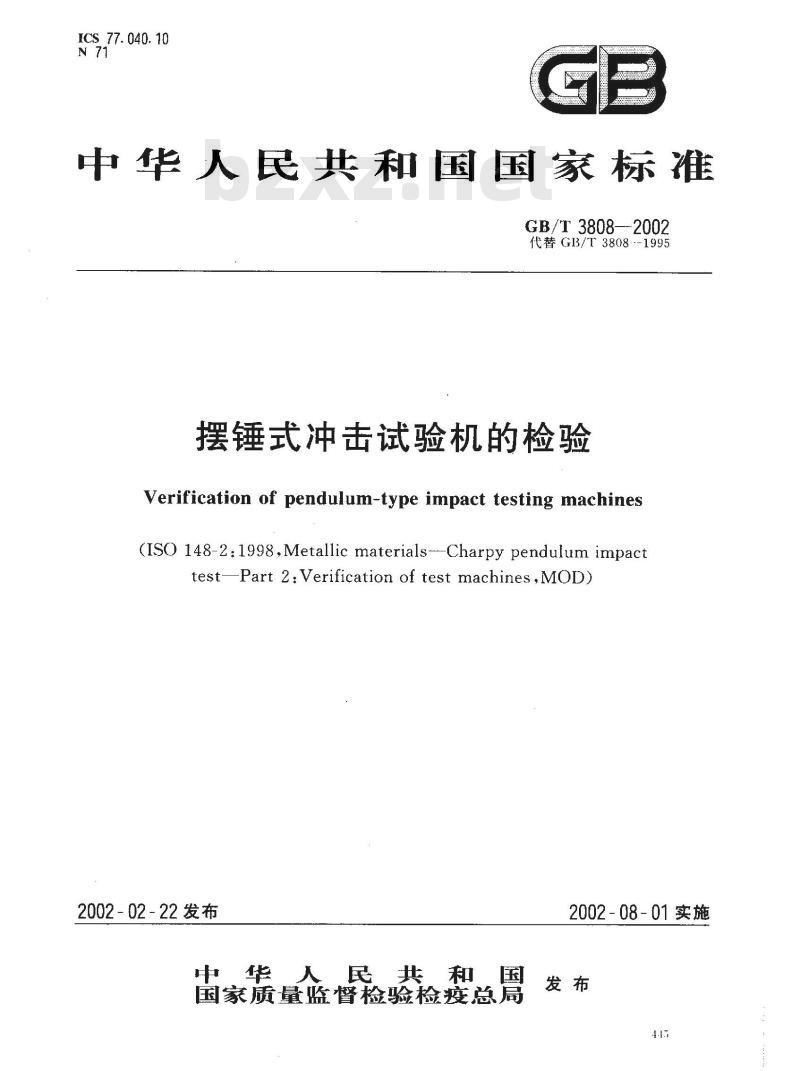 Verification of pendulum-type impact testing machines(ISO 148-2: 1998,Metallic materials---Charpy pendulum impacttestPart 2:Verification of test machines,MOD)2002-02-22发布