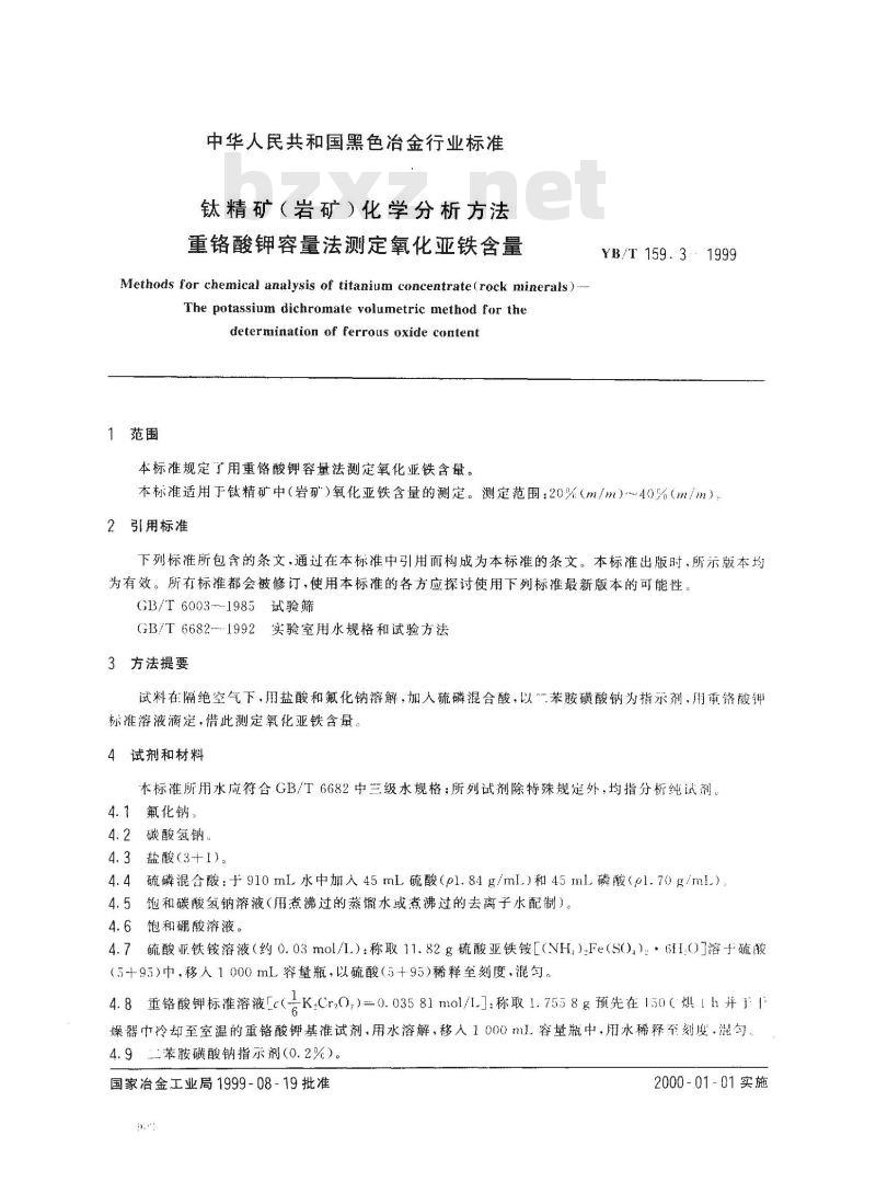 - YB/T 159.3-1999 钛精矿(岩矿)化学分析方法 重铬酸钾容量法测定氧化亚铁含量