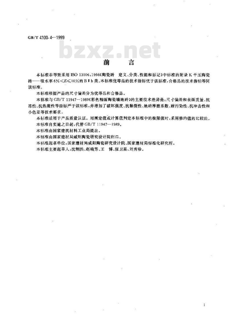 - GB/T 4100.4-1999 干压陶瓷砖 第4部分:炻质砖(吸水率6%<E ≤10%)