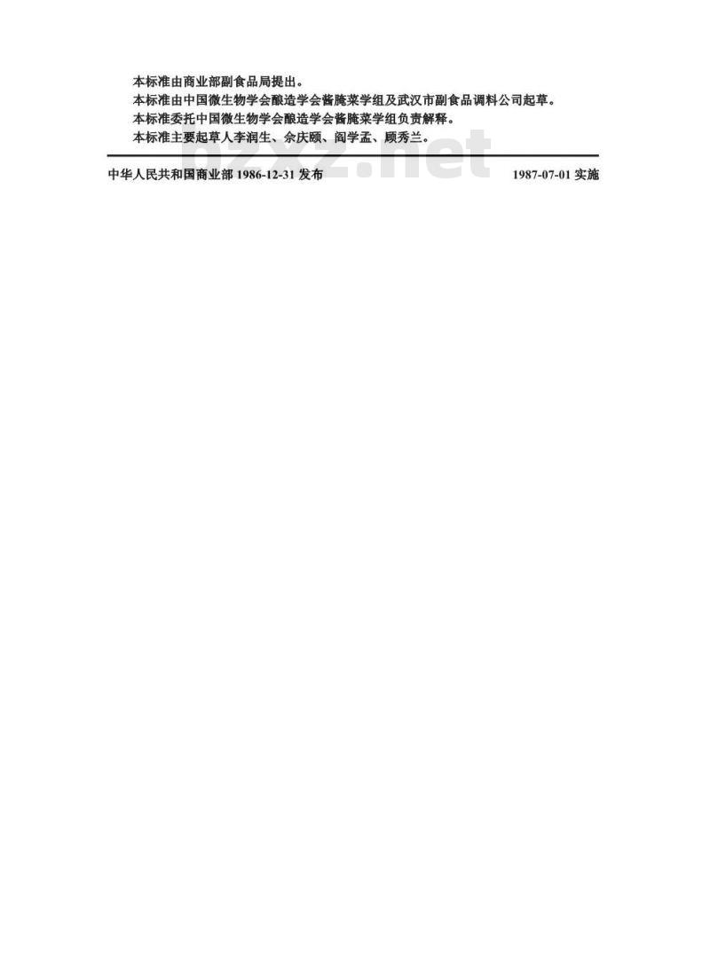 本标准由商业部副食品局提出。本标准由中国微生物学会酿造学会酱腌菜学组及武汉市副食品调料公司起草。本标准委托中国微生物学会酿造学会酱腌菜学组负责解释。本标准主要起草人李润生、余庆颐、阁学孟、顾秀兰,中华人民共和国商业部1986-12-31发布1987-07-01实施