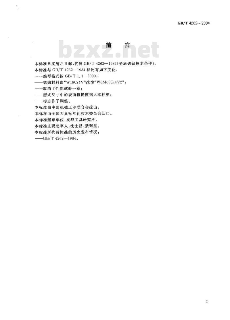 本标准自实施之日起,代替GB/T4262--1984《平底锶钻技术条件》本标准与GB/T4262~-1984相比有如下变化:编写格式按GB/T 1.1—2000;