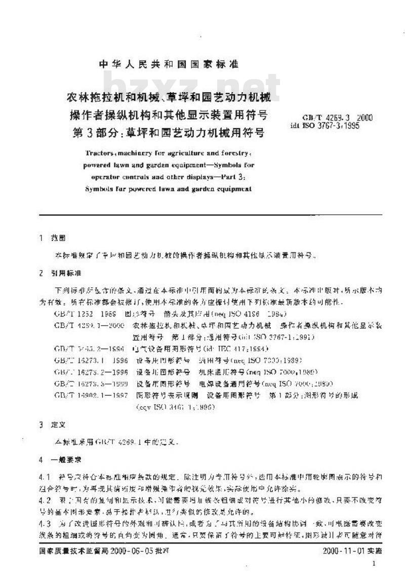 本标准规定了草坪和园艺动力机械的操作者操纵机构和其他显示装置用符号。 GB/T 4269.3-2000 农林拖拉机和机械、草坪和园艺动力机械 操作者操纵机构和其他显示装置用符号 第3部分:草坪和园艺动力机械用符号 GB/T4269.3-2000