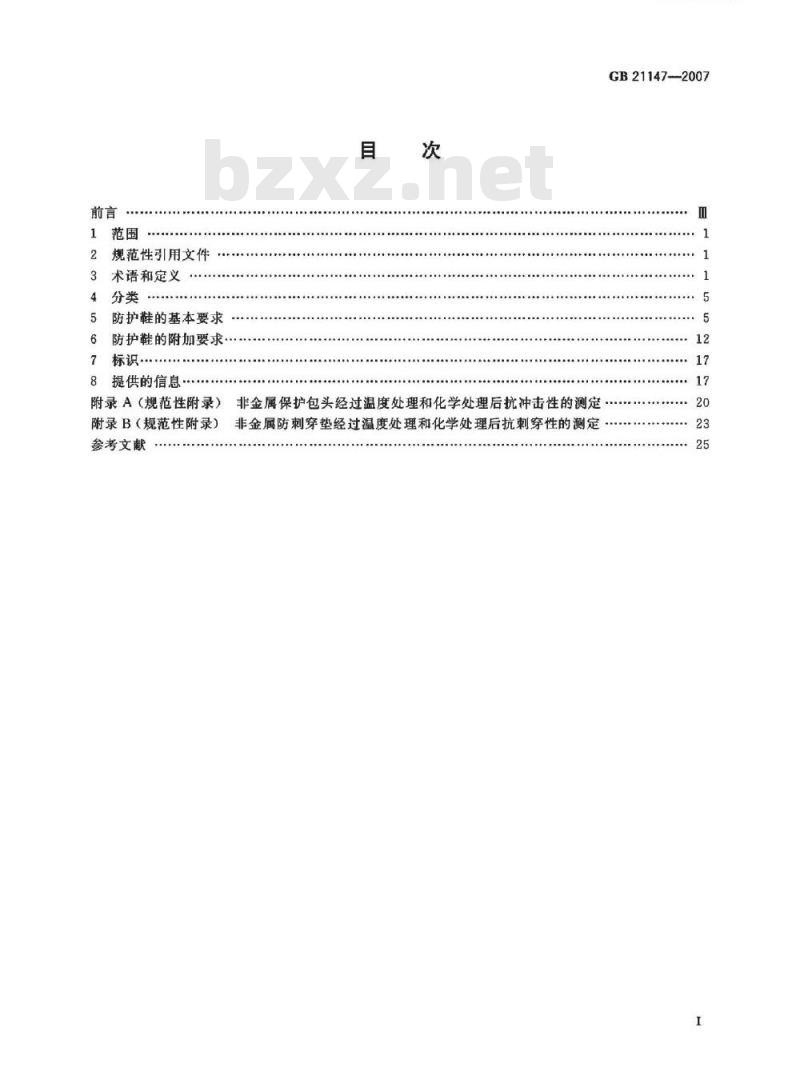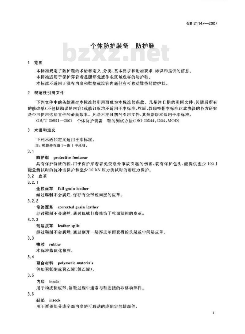 标准规定了防护鞋的术语和定义、分类、基本要求和附加要求、标识和提供的信息。适用于保护穿着者足腿部免遭作业区域危害的防护鞋,不适用于没有内底和鞋垫或没有内底但有可移动鞋垫的防护鞋。 GB 21147-2007 个体防护装备防护鞋 GB21147-2007