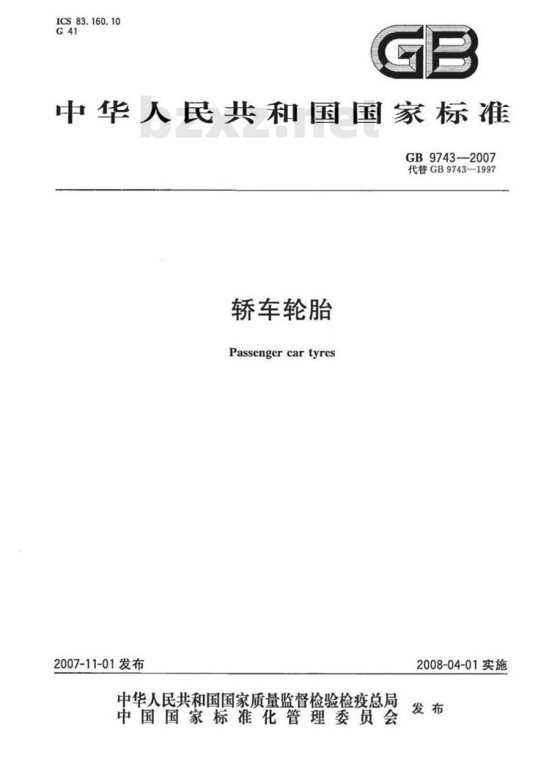 本标准的4.1~4.6、4.7.1、第6章为强制性的,其余为推荐性的。本标准代替GB9743—1997《轿车轮胎》。本标准与GB9743-1997相比主要变化如下:取消了规格尺寸表,以引用文件的形式给出(1997年版的4.1:本版的4.1);GB9743-—2007