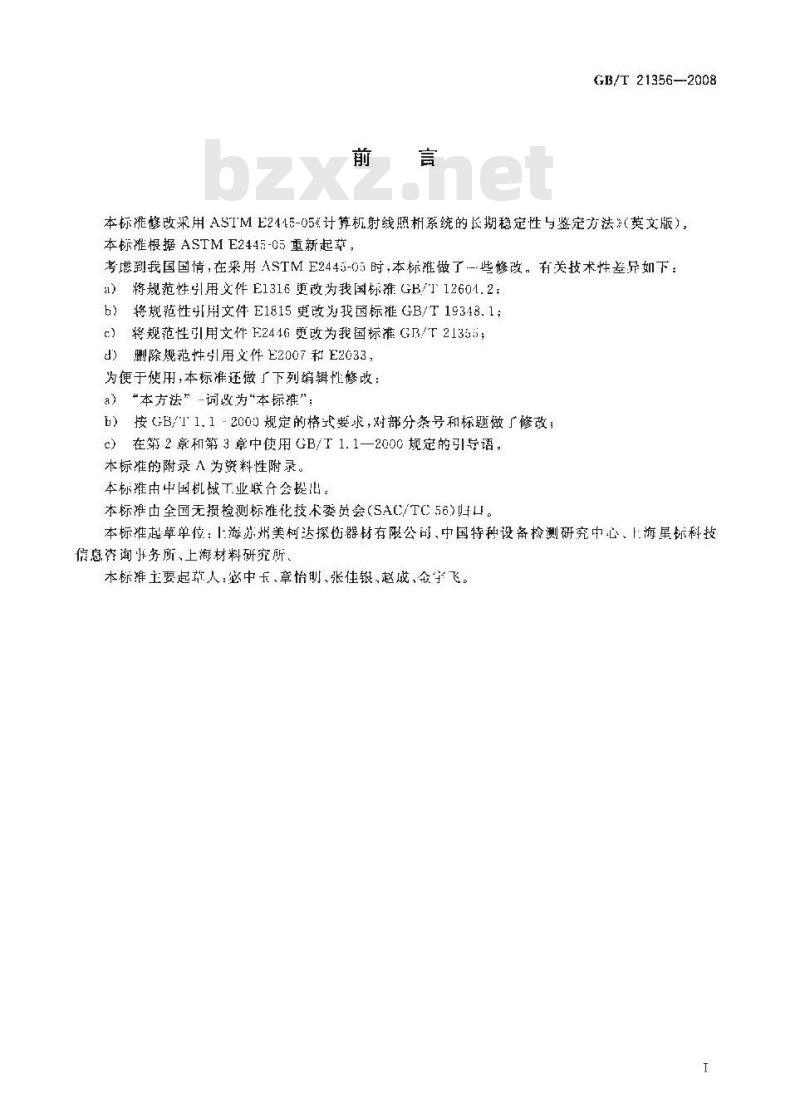 本标准修改采用ASTME2415-05&计算机射线照相系统的长期稳定性与鉴定方法\(英文版),本标准根据ASTM E2445-05 重新起革,考虑到我国国情,在采用 ASTM E2445-0 时,本标准做了-些修改。有关技术性差如下:a)将规范性引用文件E1316更改为我国标准GB/T12601.2:b)将规范性用文件E1815更改为我国标准GB/T19348.1:c)将规范性引用文件F244G更改为我国标准GB/T21355;d)删除规范性引用文件E2007和E2033,为便于使用,本标准还做了下列编辑性修改:a)\本方法”词为“本标推”;6b)按GB/T1.1~2000规定的格式要求,对部分条号和标题做了修改:c)在第 2 章和第 3 章中使用GB/T 1.1一200G规定的引导语。本标准的附录 A 为资料性附录。本标雅由中国机械工业联合会提出本标准由全国无损检测标准化技术委员会(SAC/TC56)归山。本标准起草单位:上海苏州美柯达探器材有限公司、中国特种设备检测研究中心、1.海星标科技信息咨询开务所,上游材料研究所本标推王要起草人:必中玉、章怡、张佳银,赵成金宇飞。1范围