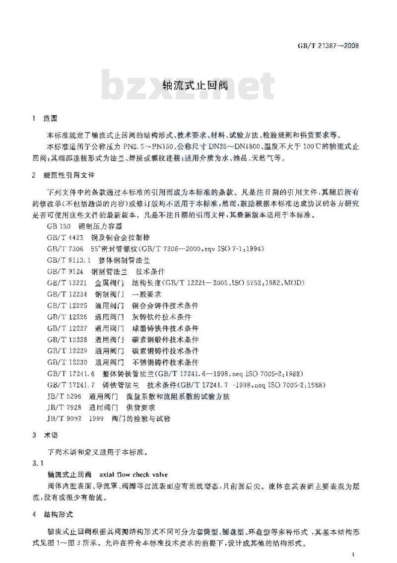 本标准规定了轴流式止回阔的结构形式、技术要求,材料,试验方法,检验规则和供货要求等。本标准适用于公称压力PN2.5~PN150.公称尺寸DN25~DN1800、温度不大于100℃的轴流式止回阀;其端部连接形式为法兰、焊接或螺纹连接;适用介质为水,油品,天然气等。2规范性引用文件