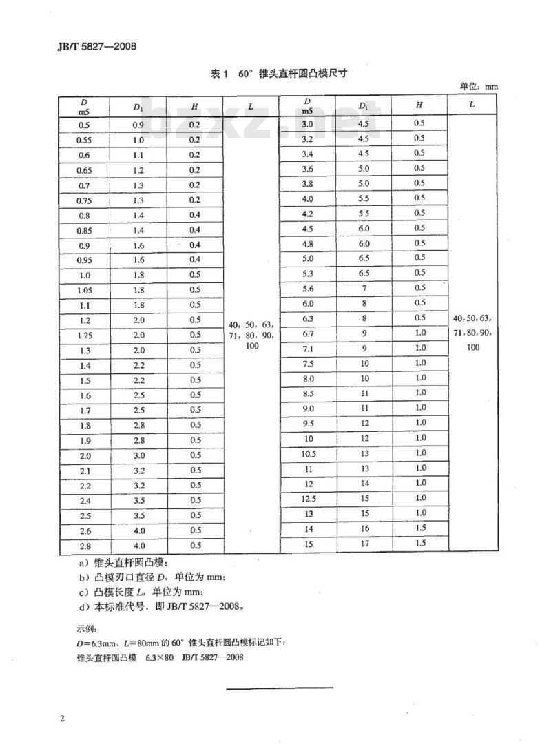 D=6.3mm、L=80mm的60°锥头直杆圆凸模标记如下:锥头直杆圆凸模6.3×80JB/T5827—20082