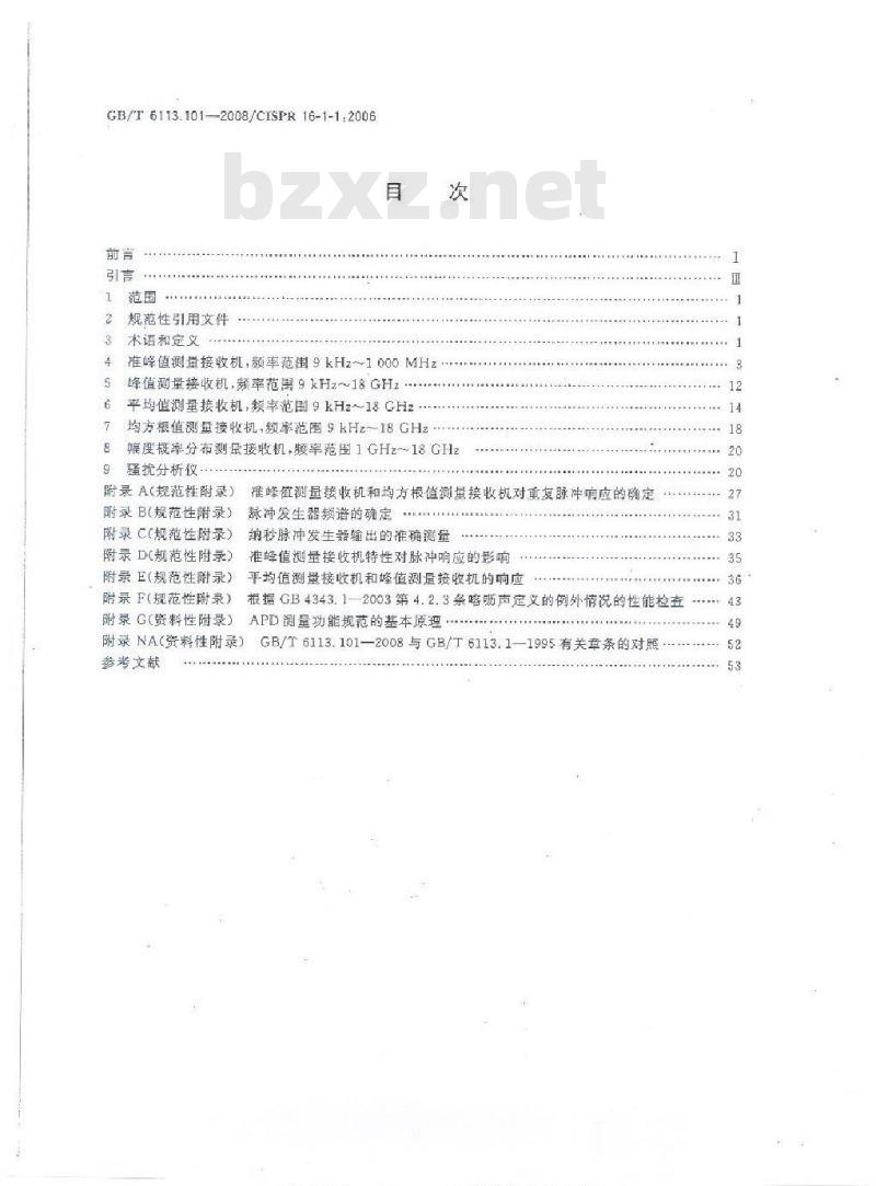 GB/T 6113.101—2008/CISPR 16-1-1:2Q06GB/T6113.101为基础标准GB/T6113的组成部分,由9章和8个附录组成。它规定了9kHz~18GHz题率范围用于测量无线电强扰电压、疆扰电流和骚抗场强的测量设备的性能和技术规范。此外,对用于断续强扰测量的专用设备也提出了要求。这些要求适用于无线电骚扰的宽带测量和窄带测量。对测量接收机提出的所有要求应在CISPR指示范由内所有的频率和无线电骚优电压、电流、功率或场强的所有电平上得到满足。本规范当中涉及含有4种类型的检被器的测量设备:准峰值测量接收机、峰值测量接收机、平均值测量接收机、均方根值r,Tm.5.)测量接收机和幅度概率分布测试功能的测量接收机,以及一种专门用于喀啊声测量的骚抗分析仪,为了确定上述设备的性能和符合性,本部分还在相应的规范性附录中给出了准峰值测量接收机和均方根值测蛋接收机对重复脉冲响应的确定方法,检验测量接收机符合性的试验脉冲频谱的确定和精确测定方法,推峰值测量接收机对脉冲响应的影响,平均值和峰值测量接收机的响应,不符合略声定义时的性能核查;在资料性附录G中,给出了新增设备APD测量功能规范的基本原理。