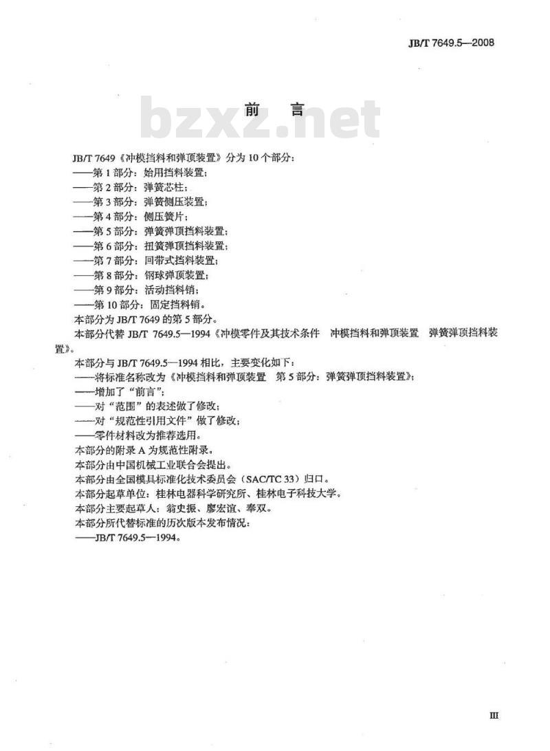 本部分与JB/T7649.5-—1994相比,主要变化如下:将标准名称改为《冲模挡料和弹顶装置第5部分:弹簧弹顶挡料装置》;一增加了“前言”