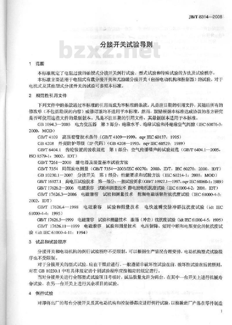 本标准规定了电阻过渡的油浸式分接开关例行试验、型式试验和特殊试验的方法及试验程序。本标准主要适用于电阻式有载分接开关和无励磁分接开关(包括电动机构和控制器)的试验。对于电抗式及其他型式分接开关的试验可参照本标准。 JB/T 8314-2008 分接开关 试验导则 JB/T8314-2008
