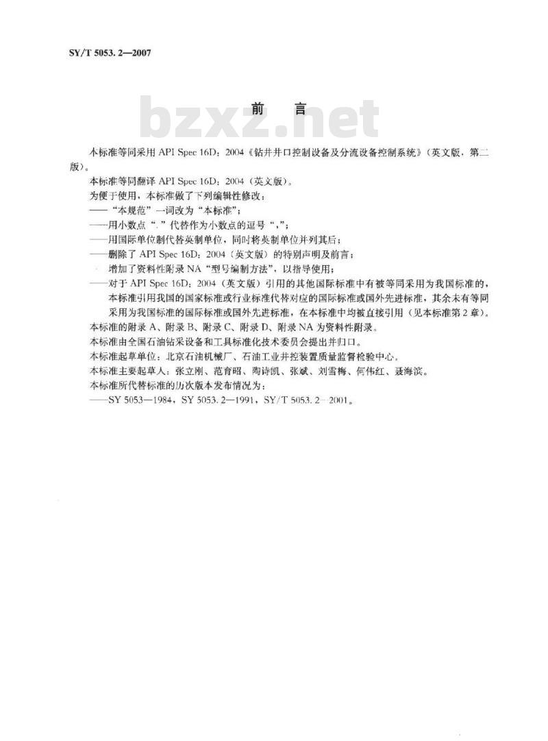 本标准等同翻译APISpec16D:2004(英文版)。为便于使用,本标准做了下列编辑性修改:“本规范”一词改为“本标准”;用小数点“”代替作为小数点的逗号“,”;用国际单位制代替英制单位,同时将英制单位并列其后;删除了APISpec16D:2004(英文版)的特别声明及前言;增加了资料性附录NA“型号编制方法”,以指导使用;对于APISpec16D:2004(英文版)引用的其他国际标准中有被等同采用为我国标准的,本标准引用我国的国家标准或行业标准代替对应的国际标准或国外先进标准,其余未有等同采用为我国标准的国际标准或国外先进标准,在本标准中均被直接引用(见本标准第2章)。本标准的附录A、附录B、附录C、附录D、附录NA为资料性附录。本标准由全国石油钻采设备和工具标准化技术委员会提出并归口。本标准起草单位:北京石油机械厂、石油工业井控装置质量监督检验中心。本标准主要起草人:张立刚、范育昭、陶诗凯、张斌、刘雪梅、何伟红、聂海滨。本标准所代替标准的历次版本发布情况为:SY5053—1984,SY5053.2—1991,SY/T5053.2-20011范围