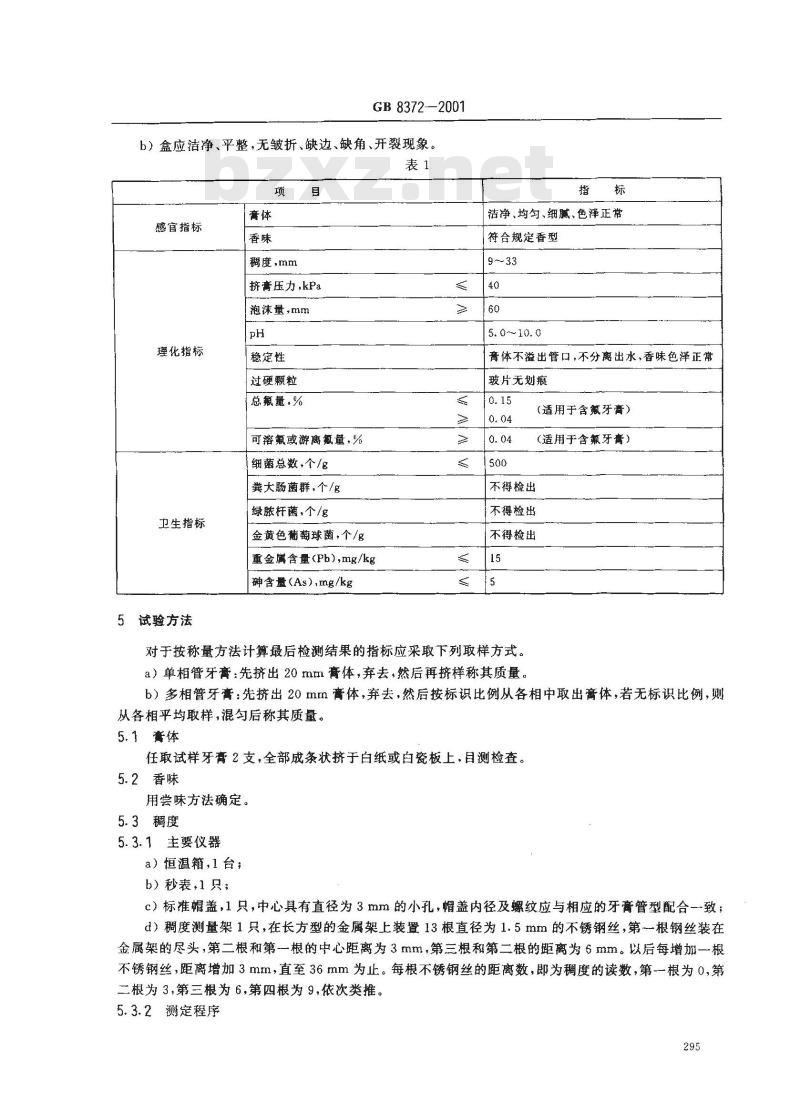 本标准规定了牙膏的技术要求、试验方法、检验规则和标志、包装、运输、贮存等要求。本标准适用于口腔内应用的各种牙膏。 GB 8372-2001 牙膏 GB8372-2001