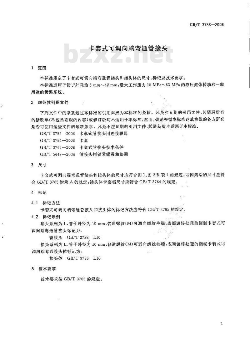 卡套式可调向端弯通管接头和接头体的标记方法应符合CB/T3765的规定,4.2标记示例bZxz.net