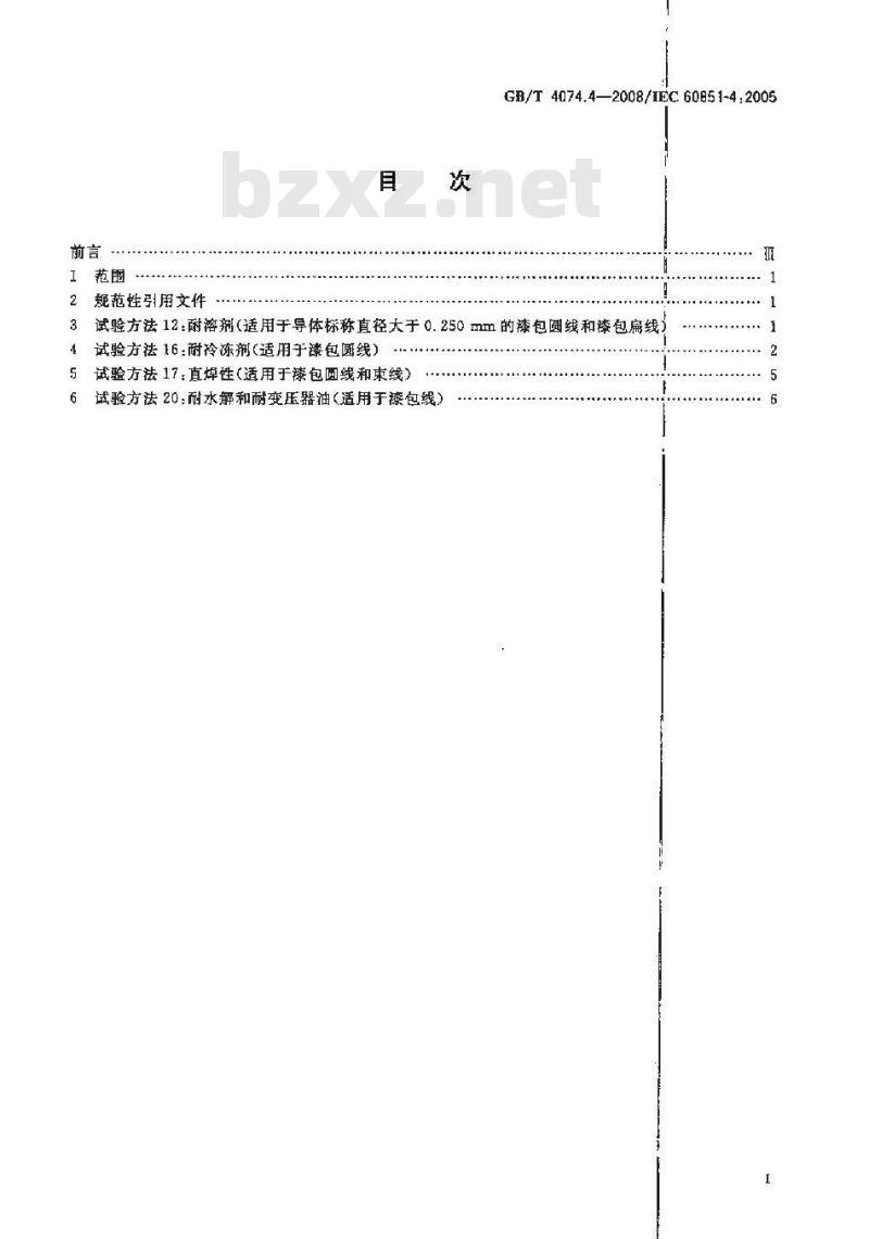 GB/T 4074.4—2008/1EC 60851-4:20053试验方法12:耐溶剂(适用于导体标称直径大于0.250mm的漆包圆线和漆包扁线4试验方法16:耐冷冻剂(适用于漆包圆线)5试验方法17:直焊性(适用于漆包圆线和束线)6试验方法20:耐水解和耐变压器油(适用于漆包线)前言