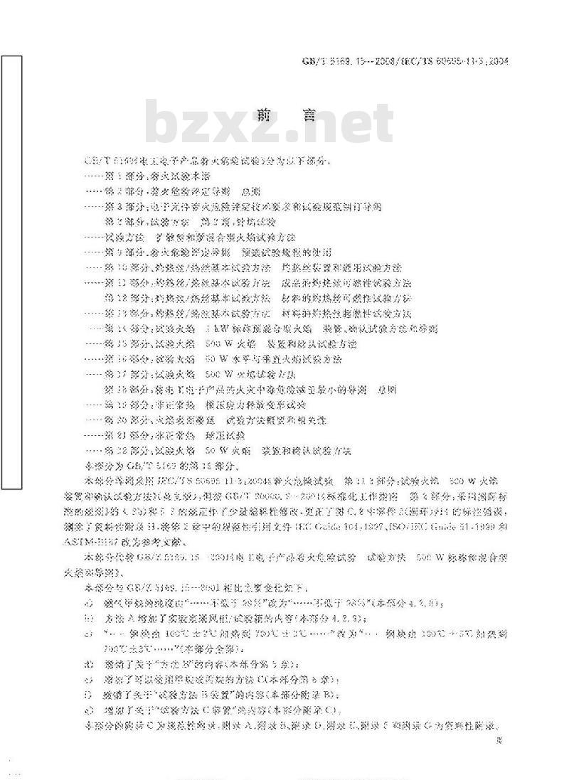 本部分于2001年首次发布,本次为第一次修订。GB/T 5169《电工电子产品着火危险试验》分为22个部分,本部分为GB/T 5169的第15部分。本部分代替GB/Z 5169.15-2001《电工电子产品着火危险试验 试验方法 500W标称预混合型火焰和导则》。 GB/T 5169的本部分规定了产生500W标称预混合型试验火焰的具体要求。火焰的总高度大约为125mm。本部分给出了两种试验火焰:方法A火焰以甲烷为燃料,方法C火焰以甲烷或丙烷为燃料。 本部分与GB/Z 5169.15-2001相比主要变化如下:a) 燃气甲烷的纯度由“……不低于99%”改为“……不低于98%”(本部分4.2.8);b) 方法A增加了实验室通风柜/试验箱的内容(本部分4.2.9);c) “……铜块由100℃±2℃加热到700℃±3℃……”改为“……铜块由100℃±5℃加热到700℃±3℃……”(本部分全部);d) 撤销了关于“方法B”的内容(本部分第5章);e) 增加了可以使用甲烷或丙烷的方法C(本部分第6章);f) 撤销了关于“试验方法B装置”的内容(本部分附录B);g) 增加了关于“试验方法C装置”的内容(本部分附录C)。 GB/T 5169.15-2008 电工电子产品着火危险试验 第15部分: 试验火焰 500W火焰 装置和确认试验方法 GB/T5169.15-2008