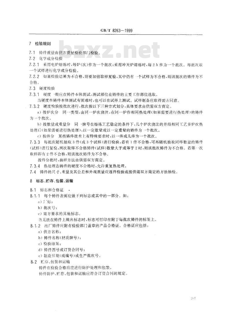 本标准规定了镍铬合金抗磨白口铸铁件和铬合金抗磨白口铸铁件的产品牌号、技术要求、试验方法、检验规则、包装、标志和运输等。本标准适用于冶金、建材、电力、建筑和机械等行业的磨料磨损部件。其他类型的抗磨白口铸铁件也可参照执行。 GB/T 8263-1999 抗磨白口铸铁件 GB/T8263-1999