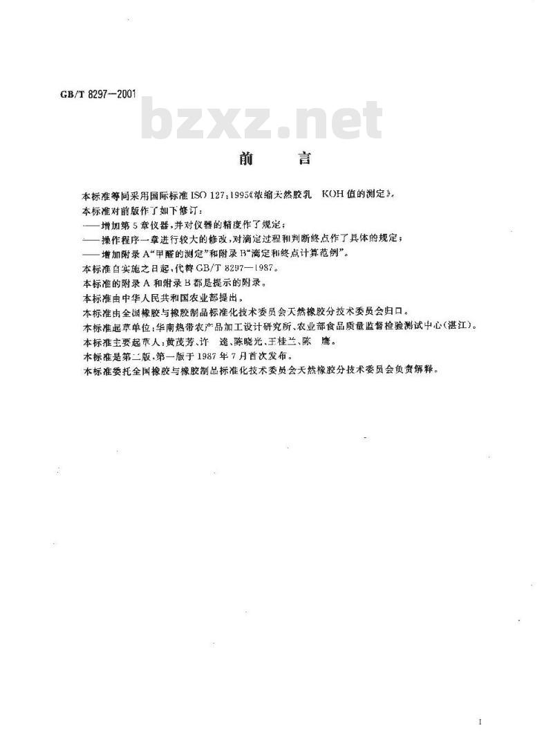 -增加第5章仪器,并对仪器的精度作了规定;-操作程序一章进行较大的修改,对滴定过程和判断终点作了具体的规定;增加附录A“甲醛的测定”和附录B\滴定和终点计算范例”。本标准自实施之日起,代警GB/8257—[987。本标准的附录A和附录B都是提示的附录。本标准由中华人民共和国农业部提出。本标准由全国榜胶与橡胶制品标准化技术委员会天然橡胶分技术委员会归口。本标准起草单位:华南热带农产品加工设计研究所、农业部食品质量监督检验测试中心(湛江)。本标推主要起草人黄茂芳、许遂、陈晓光、王桂兰、陈鹰。本标准是第二版,第一版于1987年7月首次发布。本标准委托全国橡胶与橡胶制品标准化技术委员会天然橡胶分技术委员会负责解释。GB/T 8297—2001