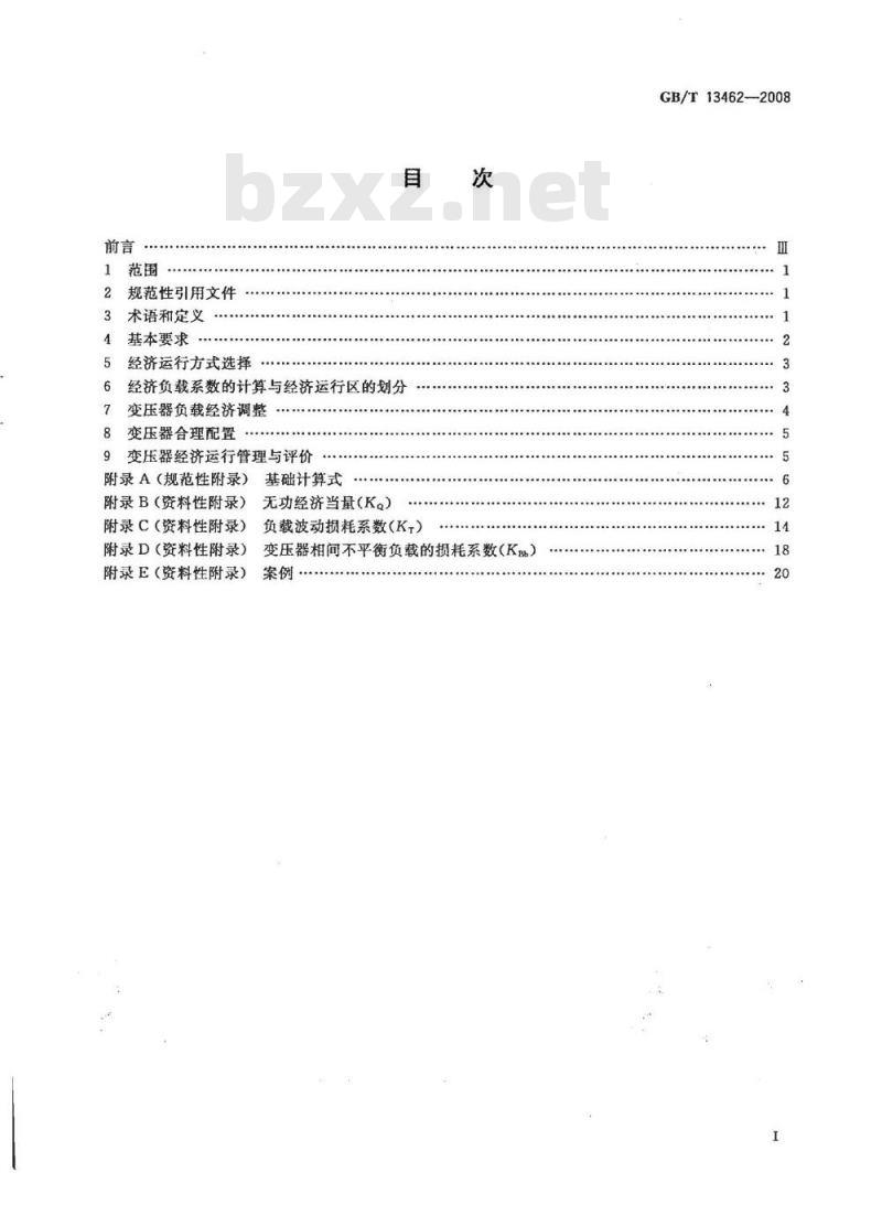 本标准于1992年首次发布,本次为第一次修订。本标准代替GB/T13462—1992 《工矿企业电力变压器经济运行导则》。本标准规定了电力变压器经济运行的原则与技术要求,以及确定经济运行方式的计算方法和管理要求。本标准适用于发电、供电、用电单位运行中的电力变压器的经济运行管理,以及单位新建、改建中电力变压器的配置。本标准与GB/T13462—1992相比主要变化如下:———删除了原标准名称中的“工矿企业”和“导则”。———适用范围改为“本标准适用于发电、供电、用电单位运行中的电力变压器的经济运行管理,以及单位新建、改建中电力变压器的配置”。———删除了原3.9“有功负荷率”的术语,增加了“无功经济当量”、“相间不平衡负载损耗系数”、“非经济运行区”、“负载经济分配”、“经济容量”、“经济台数”等术语。———取消原基本计算式的章条,将基本计算公式放到附录A 中,并在附录A 中增加了三绕组变压器的基本计算公式。———在经济运行方式选择中,增加了并列运行的三绕组变压器经济运行方式的选择。———在经济运行区的确定中,增加了“经济负载系数”、“三绕组变压器最佳经济负载系数”和“三绕组变压器经济运行区”。———增加了变压器负载调整的内容。———取消了原经济运行节电量计算的章条。———增加了“变压器相间不平衡负载的损耗系数”、“无功经济当量”、“基础计算式”和“案例”四个附录。 GB/T 13462-2008 电力变压器经济运行 GB/T13462-2008