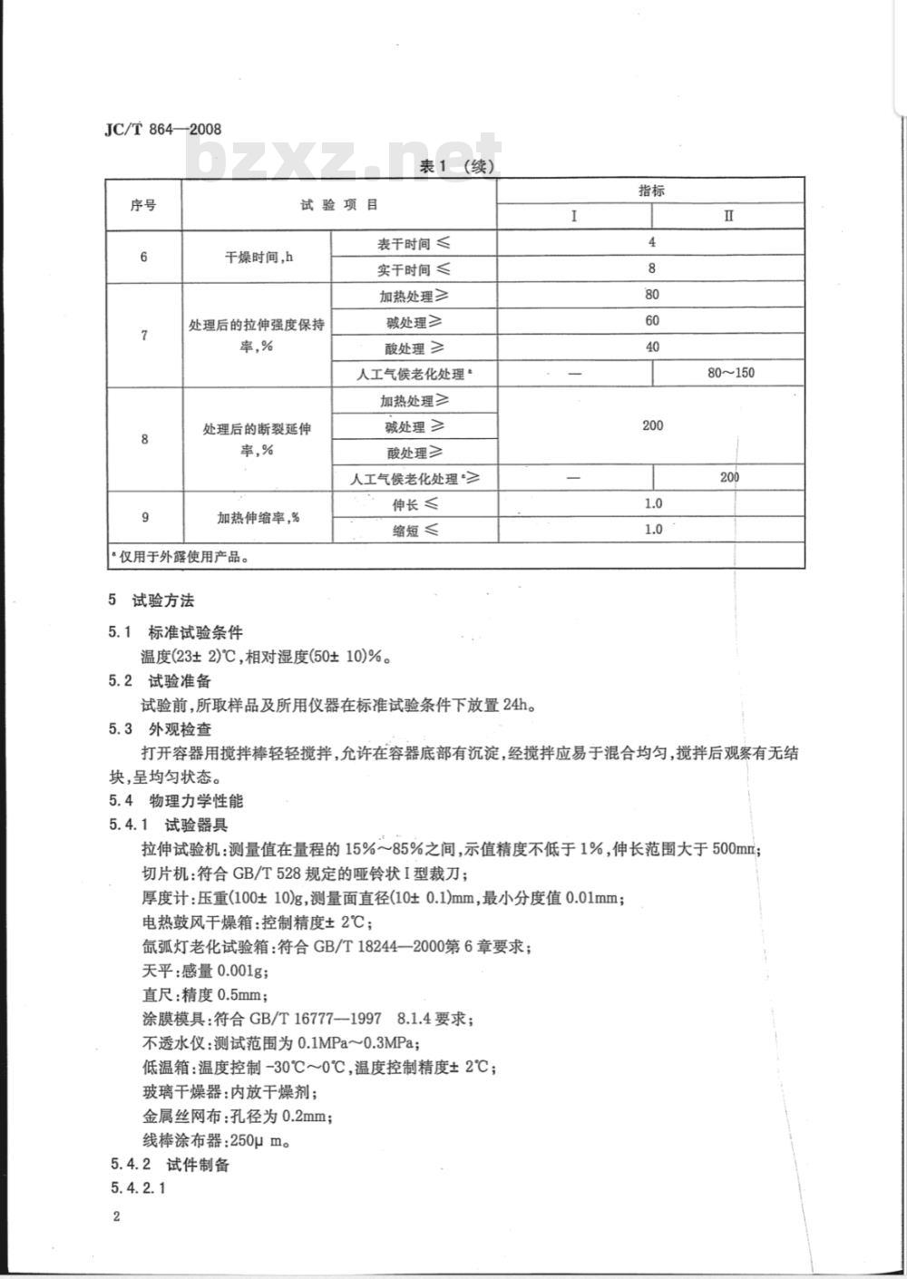 -碱处理和酸处理后在干燥箱中放置的温度和时间做了调整。本标准与JISA6021—2000的主要差异是:-Ⅱ类产品除拉伸强度高于JISA6021一2000指标外,其他指标相当;取消了原材料章节,增加了一般要求;只包括聚合物乳液建筑防水涂料;-按产品物理性能分为I类和Ⅱ类;一人工气候老化采用氙弧灯替代碳弧灯,累计辐照时间250h修改为累计辐照能量1500MJ/m2(约720h);