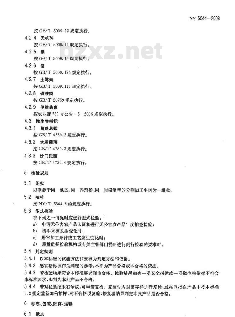 5.4.1以本标准的试验方法和要求为判定方法和依据。5.4.2感官指标仅作为判定的参考,不作为产品合格或不合格的依据。NY5044-2008