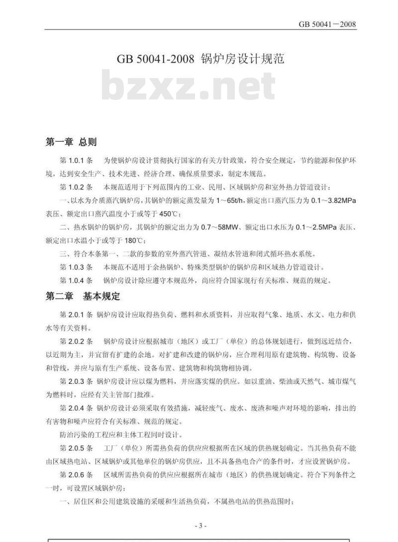 第1.0.1条为使锅炉房设计贯彻执行国家的有关方针政策,符合安全规定,节约能源和保护环境,达到安全生产、技术先进、经济合理、确保质量要求,制定本规范。第1.0.2条本规范适用于下列范围内的工业、民用、区域锅炉房和室外热力管道设计:一、以水为介质蒸汽锅炉房,其锅炉的额定蒸发量为1~65t/h,额定出口蒸汽压力为0.1~3.82MPa表压、额定出口蒸汽温度小于或等于450℃;二、热水锅炉的锅炉房,其锅炉的额定出力为0.7~58MW、额定出口水压为0.1~2.5MPa表压、额定出口水温小于或等于180℃;三、符合本条第一、三款的参数的室外蒸汽管道、凝结水管道和闭式循环热水系统第1.0.3条本规范不适用于余热锅炉、特殊类型锅炉的锅炉房和区域热力管道设计。第1.0.4条锅炉房设计除应遵守本规范外,尚应符合国家现行有关标准、规范的规定。第二章基本规定