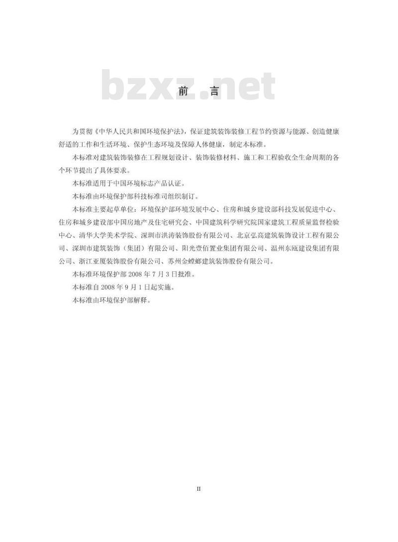 本标准适用于中国环境标志产品认证。本标准由环境保护部科技标准司组织制订。本标准主要起草单位:环境保护部环境发展中心、住房和城乡建设部科技发展促进中心、住房和城乡建设部中国房地产及住宅研究会、中国建筑科学研究院国家建筑工程质量监督检验中心、清华大学美术学院、深圳市洪涛装饰股份有限公司、北京弘高建筑装饰设计工程有限公司、深圳市建筑装饰(集团)有限公司、阳光壹佰置业集团有限公司、温州东瓯建设集团有限公司、浙江亚厦装饰股份有限公司、苏州金螳螂建筑装饰股份有限公司。本标准环境保护部2008年7月3日批准。本标准自2008年9月1日起实施。本标准由环境保护部解释。