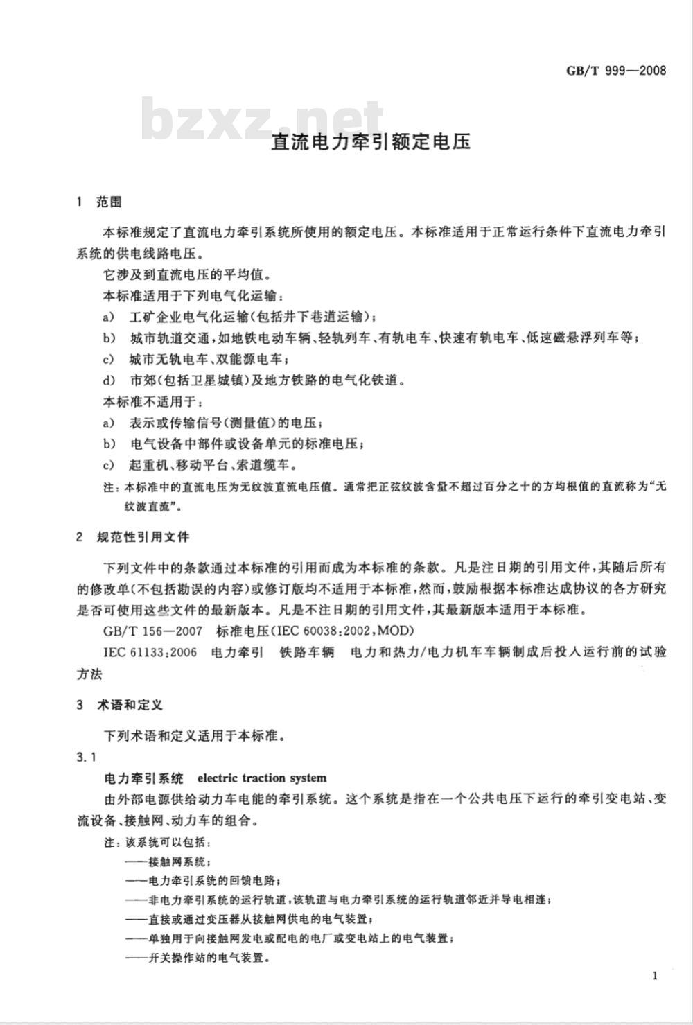 本标准是对GB/T999-1988《直流电力牵引额定电压》的修订。GB/T999--2008