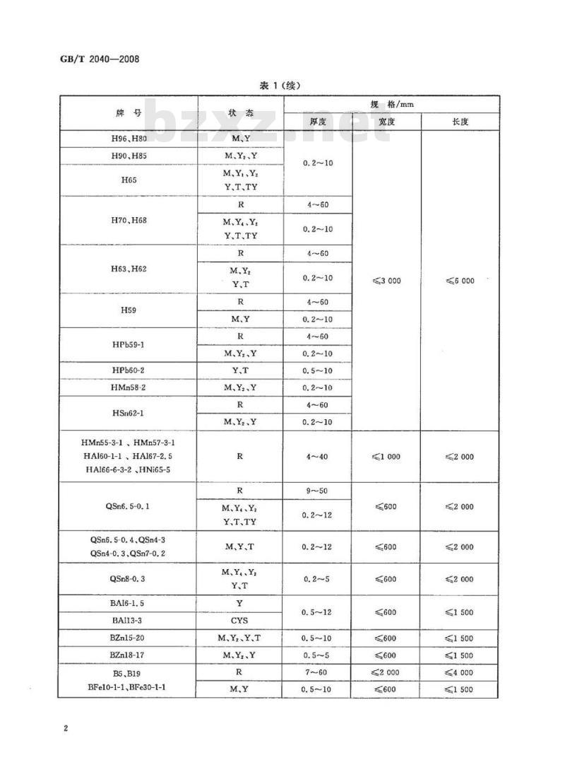 产品标记按产品名称、牌号、状态、规格和标准编号的顺序表示。标记示例如下:用H62制造的、供应状态为Y,、厚度为0.8mm、宽度为600mm,长度为1500mm的定尺板材,标记为:铜板H62Y,0.8X600X1500GB/T2040—2008表1板材的牌号、状态、规格