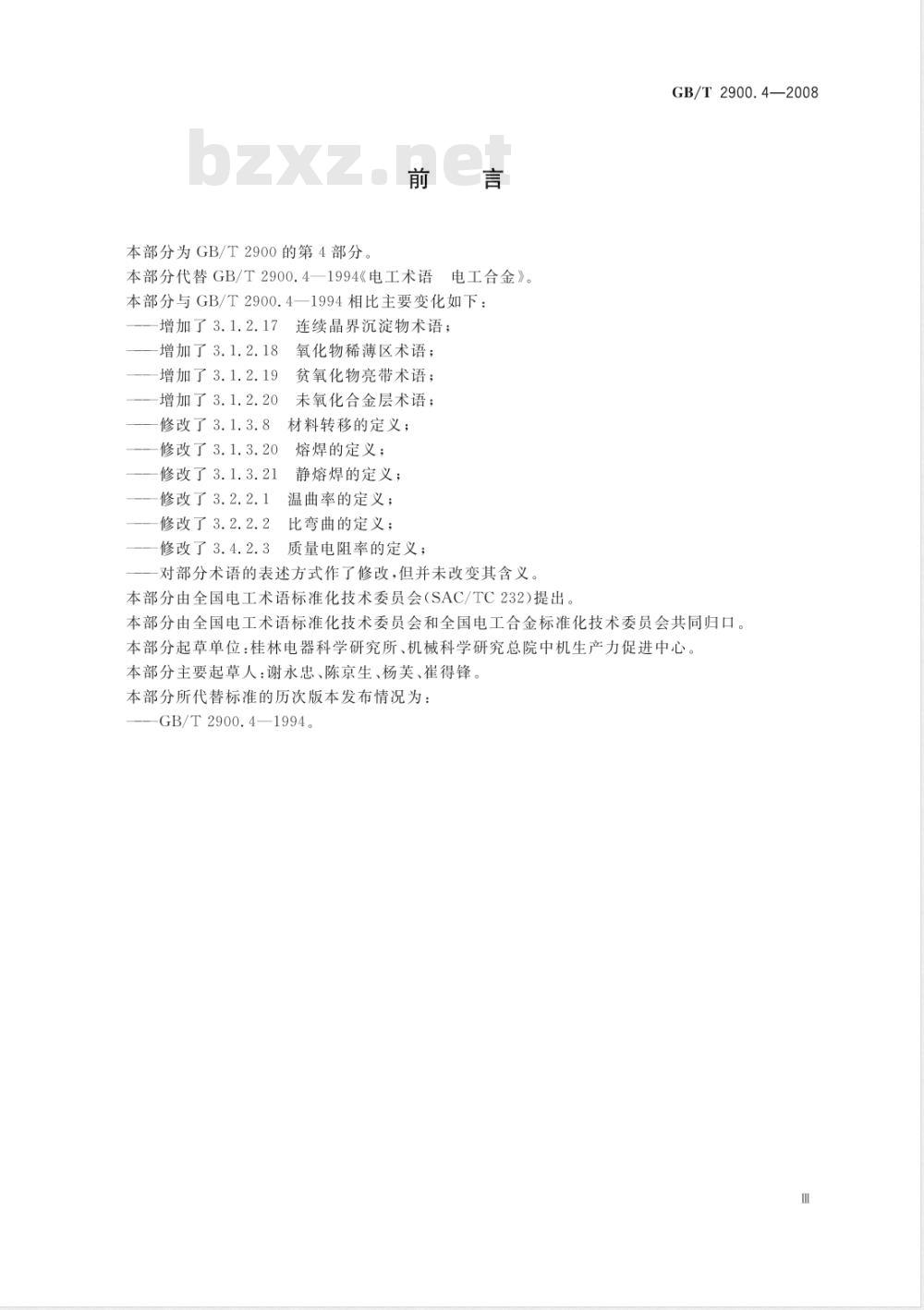 本部分为GB/T 2900的第4部分。本部分代替GB/T 2900.4-1994《电工术语 电工合金》。本部分规定了电触头、热双金属、电热合金、导电合金、电阻合金、热电偶合金及磁性材料的专用电工术语。本部分适用于电触头、热双金属、电热合金、导电合金、电阻合金、热电偶合金及磁性材料等产品标准制定、编制技术文件,编写和翻译专业手册、教材、专著等书刊,以及对外贸易、国际技术交流等。本部分与GB/T 2900.4-1994相比主要变化如下:———增加了3.1.2.17连续晶界沉淀物术语;———增加了3.1.2.18氧化物稀薄区术语;———增加了3.1.2.19贫氧化物亮带术语;———增加了3.1.2.20未氧化合金层术语;———修改了3.1.3.8材料转移的定义;———修改了3.1.3.20熔焊的定义;———修改了3.1.3.21静熔焊的定义;———修改了3.2.2.1温曲率的定义;———修改了3.2.2.2比弯曲的定义;———修改了3.4.2.3质量电阻率的定义;———对部分术语的表述方式作了修改,但并未改变其含义。 GB/T 2900.4-2008 电工术语 电工合金 GB/T2900.4-2008