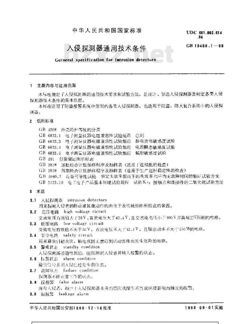 - GB 10408.1-1989 入侵探测器通用技术条件