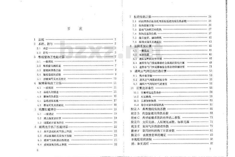 本规程的主要技术内容:1、总则,2.术诺、符号;3.整模窗热工性能计算:4.玻璃幕墙热工计算:5.结露性能评价:6.玻璃光学热工性能计算;7.框的传热计算,8.巡阳系统计算:9、通风空气间层的传热计算:10.计算边界条件;以及相关附录。