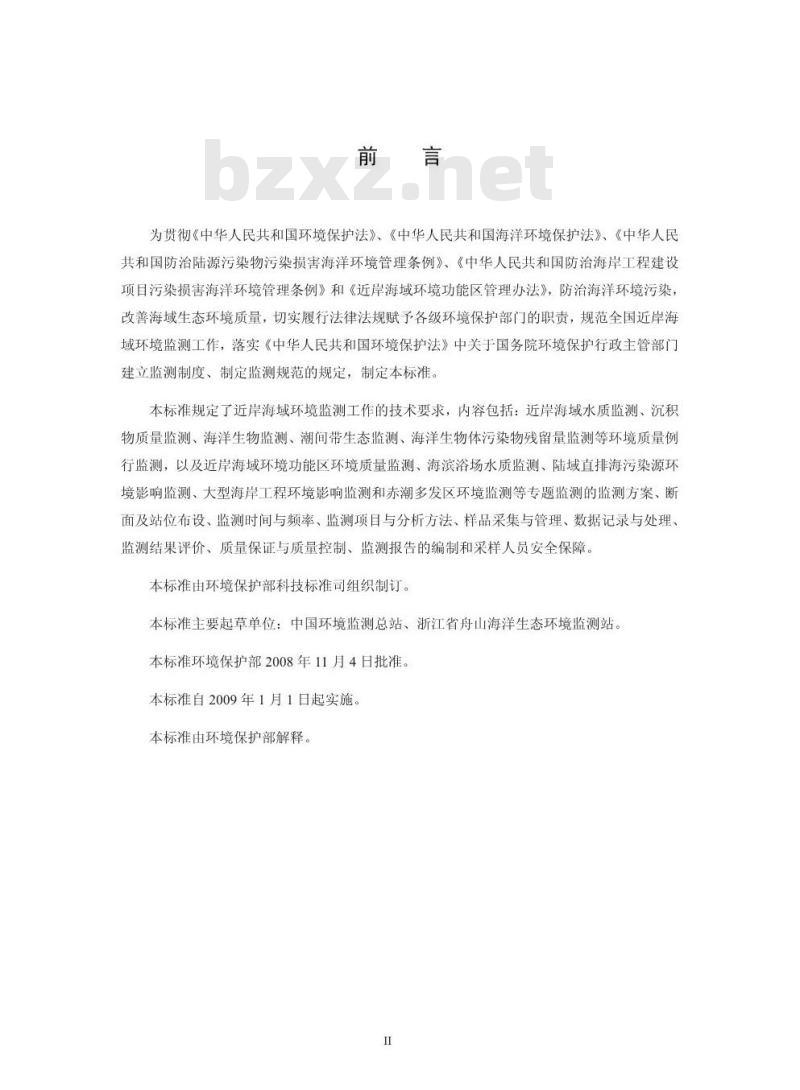 为贯彻《中华人民共和国环境保护法》、《中华人民共和国海洋环境保护法》、《中华人民共和国防治陆源污染物污染损害海洋环境管理条例》、《中华人民共和国防治海岸工程建设项目污染损害海洋环境管理条例》和《近岸海域环境功能区管理办法》,防治海洋环境污染,改善海域生态环境质量,切实履行法律法规赋予各级环境保护部门的职责,规范全国近岸海域环境监测工作,落实《中华人民共和国环境保护法》中关于国务院环境保护行政主管部门建立监测制度、制定监测规范的规定,制定本标准。本标准规定了近岸海域环境监测工作的技术要求,内容包括:近岸海域水质监测、沉积物质量监测、海洋生物监测、潮间带生态监测、海洋生物体污染物残留量监测等环境质量例行监测,以及近岸海域环境功能区环境质量监测、海滨浴场水质监测、陆域直排海污染源环境影响监测、大型海岸工程环境影响监测和赤潮多发区环境监测等专题监测的监测方案、断面及站位布设、监测时间与频率、监测项目与分析方法、样品采集与管理、数据记录与处理、监测结果评价、质量保证与质量控制、监测报告的编制和采样人员安全保障本标准由环境保护部科技标准司组织制订。本标准主要起草单位:中国环境监测总站、浙江省舟山海洋生态环境监测站。本标准环境保护部2008年11月4日批准。本标准自2009年1月1日起实施。本标准由环境保护部解释,