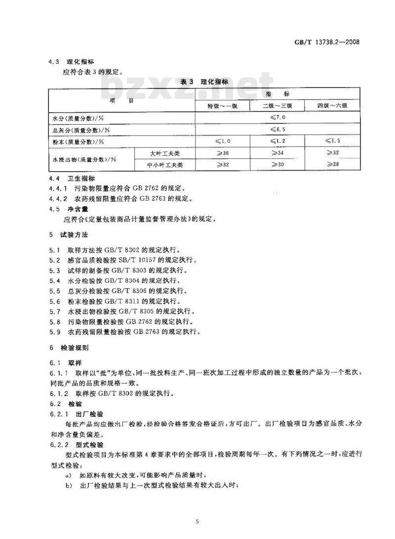 5.1取样方法按GB/T8302的规定执行。5.2感實品质检验按SB/T10157的规定执行。5.3试样的制备按GB/T8303的规定执行。水分检验按GB/T8304的规执行。5.4
