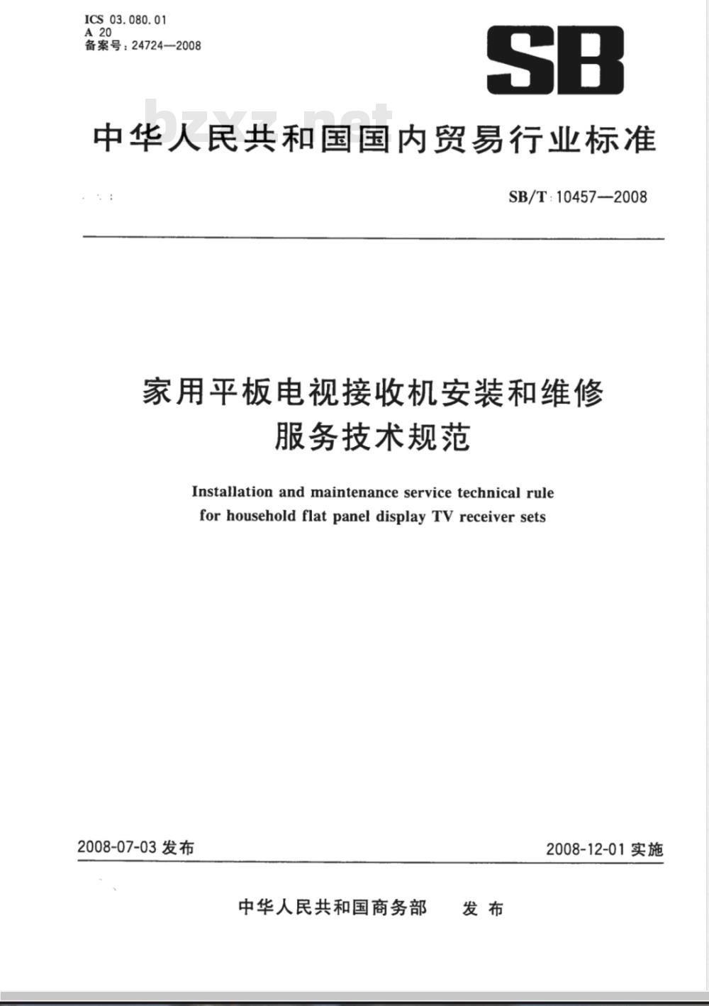 - SB/T 10457-2008 家用平板电视接收机安装和维修服务技术规范