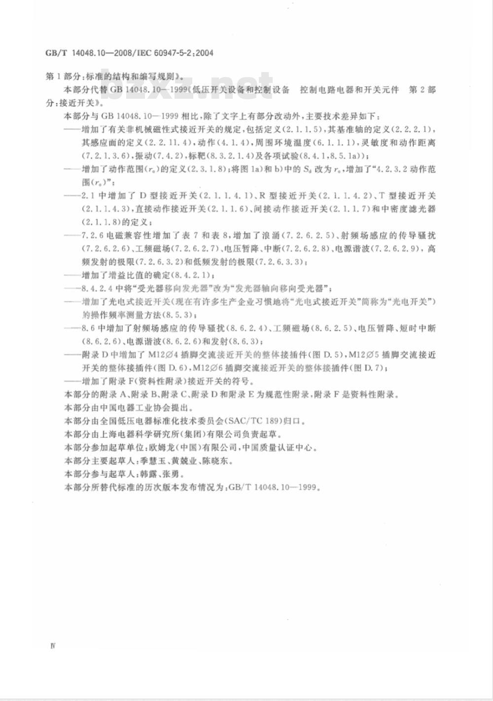 GB/T14048.10—2008/IEC60947-5-2:2004第1部分:标准的结构和编写规则》。本部分代替GB14048.10一1999《低压开关设备和控制设备控制电路电器和开关元件第2部分:接近开关》。