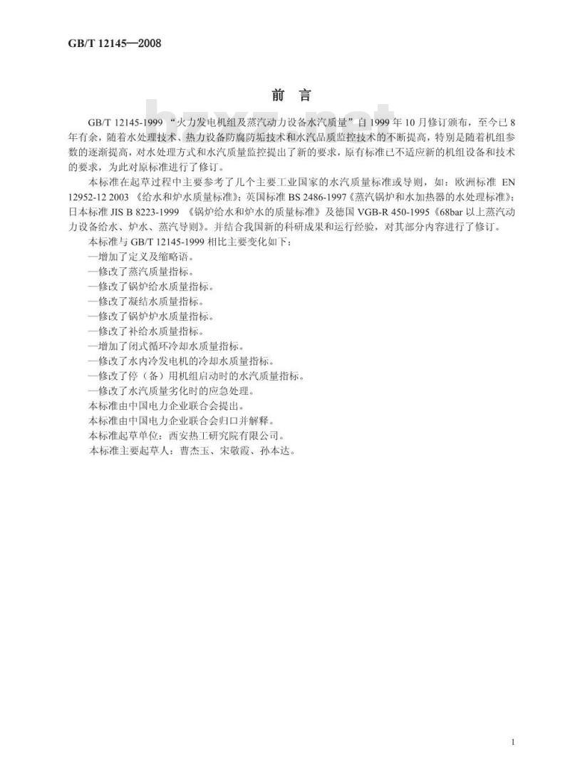 一增加了闭式循环冷却水质量指标。一修改了水内冷发电机的冷却水质量指标。修改了停(备)用机组启动时的水汽质量指标。修改了水汽质量劣化时的应急处理。本标准由中国电力企业联合会提出。本标准由中国电力企业联合会归口并解释。本标准起草单位:西安热工研究院有限公司。本标准主要起草人:曹杰宝、宋敬霞、孙本达。GB/T12145—2008