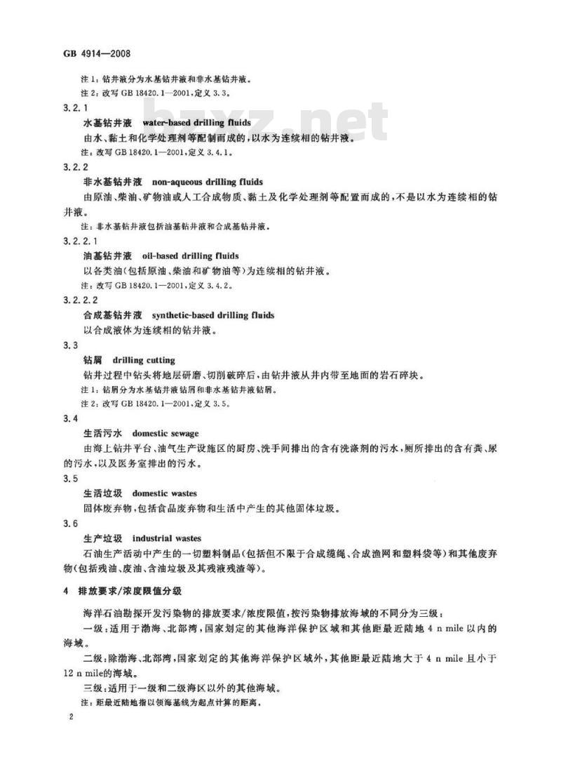 本标准适用于我国的内水、领海及其他管辖海域,对从事石油勘探开发的任何法人、自然人和其他经济实体在作业中所使用或生成后直接排放入海的生产水、钻井液、钻屑和其他污染物的排放管理。2规范性引用文件