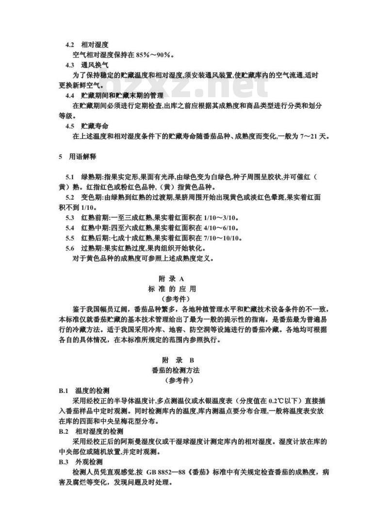 在上述温度和相对湿度条件下的贮藏寿命随番茄品种、成熟度而变化,一般为7~21天。5用语解释